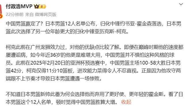 据媒体人付政浩的介绍:柯克此前在广州龙狮效力过,对他的优缺点比较了解。即便在巅峰时期他的速度都屡遭诟病,如今年近36岁的他更是难堪大用,中国男篮并不惧怕这种风格的球员。此前在2025年2月20日的亚洲杯预选赛中,中国男篮主场100-58大胜日本男篮42分,柯克仅得11分10篮板,进攻能力菜得令人不忍直视。正是因为他攻守两端跟不上节奏才导致日本男篮遭遇一场惨败。