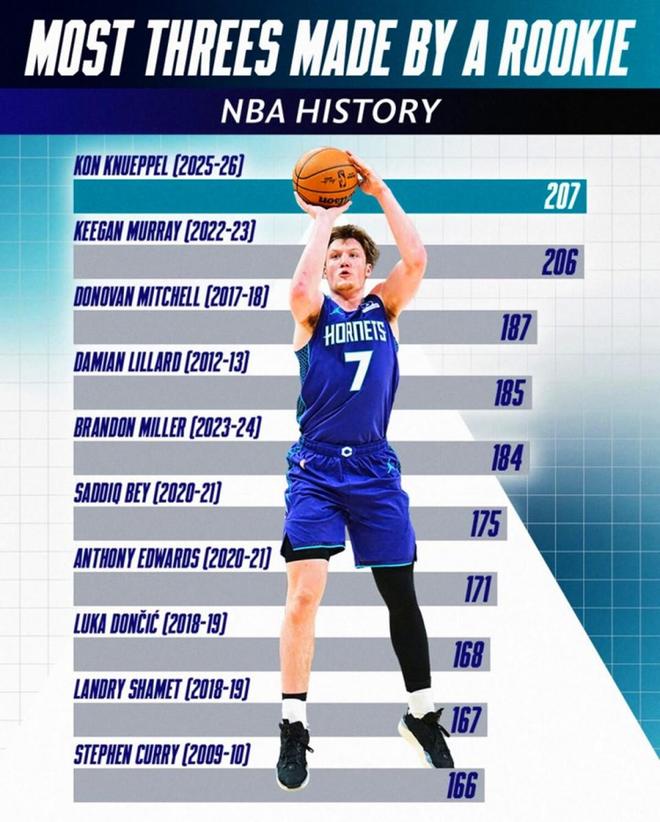 单场命中8记三分追平其个人生涯纪录,凭借这样的表现,克努佩尔本赛季已经命中209记三分,不仅高居本赛季全联盟第一,也让其超越基根-穆雷的206记三分,创造新的NBA历史新秀单赛季三分命中数纪录。