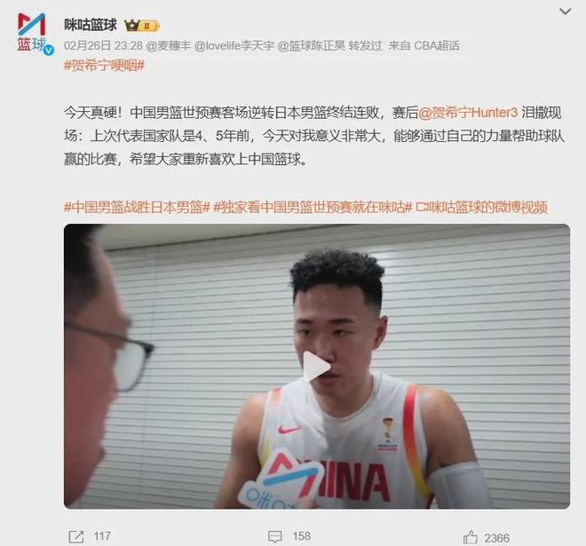 赛后接受采访时,贺希宁动情落泪,表示这场比赛对他意义重大,希望可以让大家重新喜欢上中国篮球。