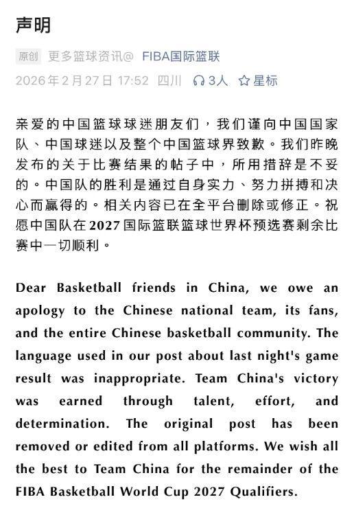 不仅如此,FIBA官方还发布声明,表示在中国男篮战胜日本男篮的比赛结果帖子中的措辞不当,而向中国男篮、中国球迷以及整个中国篮球界致歉。这则道歉声明使用了中英双语,不仅通过中文官方发出,还在引起误会的Instagram官方赛果帖的评论区同步了道歉的内容。这样来看的话,FIBA的道歉还是非常有诚意的。只是希望在以后的比赛中,FIBA官方也能要求裁判做到公平公正,不要再那么明显针对中国男篮了。