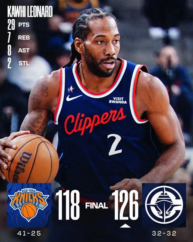 快船126-118赢下尼克斯,勇士116-119输给爵士。